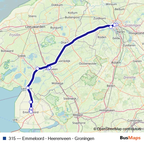 The first stop of the 315 bus route is Groningen, Hoofdstation (Perron P) and the last stop is Emmeloord, Busstation (Perron A). 315 (Emmeloord - Heerenveen - Groningen) is operational during everyday.