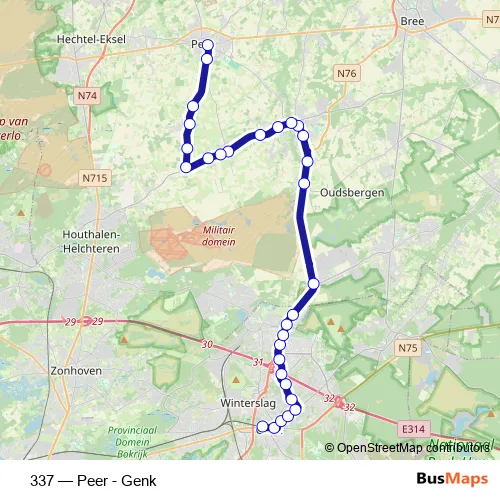 The first stop of the 337 bus route is Genk Station perron 7 and the last stop is Peer Pol Kip. 337 (Peer - Genk) is operational during on weekdays.
