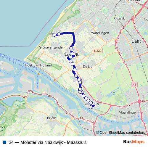The first stop of the 34 bus route is Maassluis, Station Maassluis Centrum and the last stop is Monster, Vlotlaan. 34 (Monster via Naaldwijk - Maassluis) is operational during everyday.