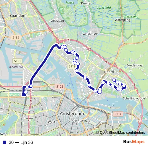 The first stop of the 36 bus route is Amsterdam, Station Sloterdijk and the last stop is Amsterdam, Station Noord. 36 (Lijn 36) is operational during everyday.