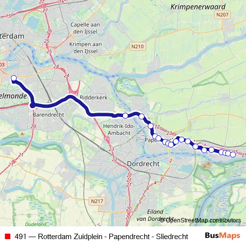 The first stop of the 491 bus route is Rotterdam, Zuidplein (Perron G) and the last stop is Sliedrecht, De Grienden. 491 (Rotterdam Zuidplein - Papendrecht - Sliedrecht) is operational during everyday.