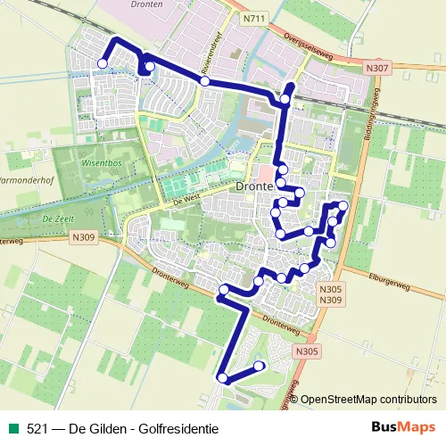 The first stop of the 521 bus route is Dronten, Wijnvat and the last stop is Dronten, Golfresidentie. 521 (De Gilden - Golfresidentie) is operational during everyday.