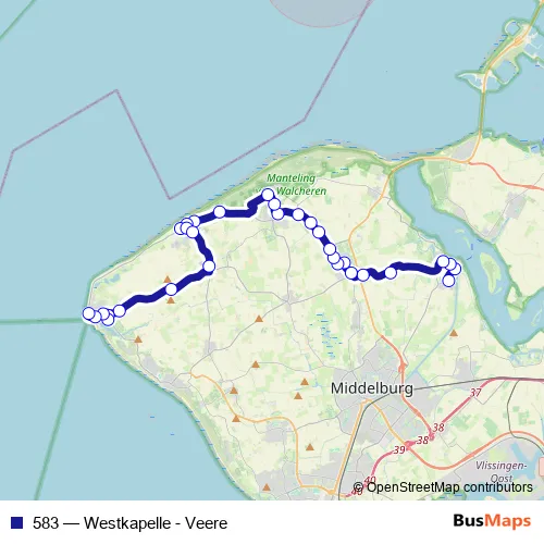 The first stop of the 583 bus route is Veere, Nieuw-Sandenburgh and the last stop is Westkapelle, Zuidstraat. 583 (Westkapelle - Veere) is operational during on weekdays.