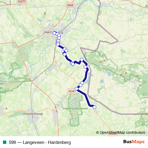 The first stop of the 598 bus route is Hardenberg, Gemeentehuis and the last stop is Langeveen, R.K. Kerk. 598 (Langeveen - Hardenberg) is operational during on weekdays.