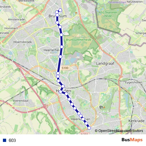 The first stop of the 603 metro route is Brunssum, Wilhelminastraat and the last stop is Kerkrade, Parkstad Stadion. 603 is operational during on weekdays.