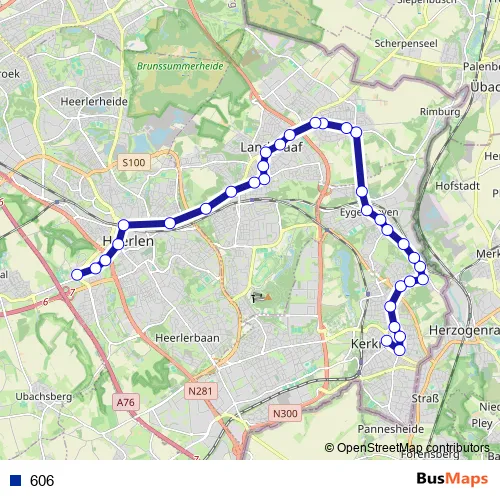 The first stop of the 606 metro route is Kerkrade, Busstation and the last stop is Heerlen, Welten Hogeschool Zuyd. 606 is operational during on weekdays.