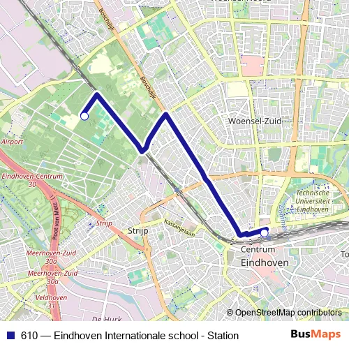 The first stop of the 610 bus route is Eindhoven, Internationale school and the last stop is Eindhoven, Station. 610 (Eindhoven Internationale school - Station) is operational during on weekdays.
