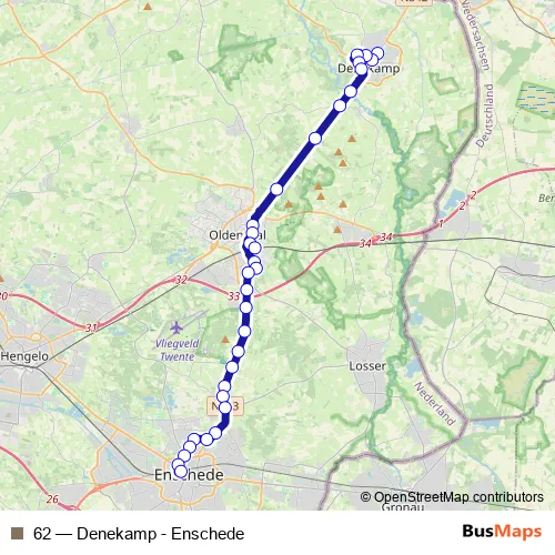 The first stop of the 62 bus route is Denekamp, Onder de Linden and the last stop is Enschede, Centraal Station. 62 (Denekamp - Enschede) is operational during everyday.