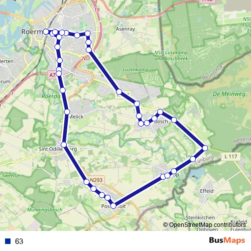 The first stop of the 63 metro route is Roermond, Station (Bus) and the last stop is Roermond, Station (Bus). 63 is operational during everyday.