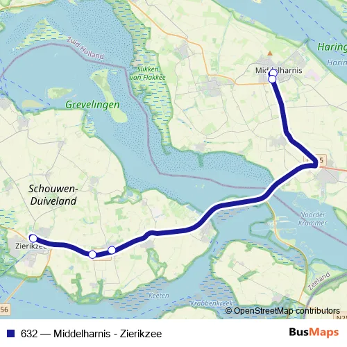 The first stop of the 632 bus route is Middelharnis, Gemeentehuis and the last stop is Zierikzee, Busstation. 632 (Middelharnis - Zierikzee) is operational during everyday.