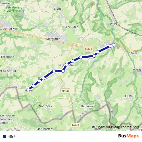 The first stop of the 657 metro route is Gulpen-Wittem, Gulpen Busstation and the last stop is Eijsden-Margraten, Mheer Kerk. 657 is operational during on weekdays.