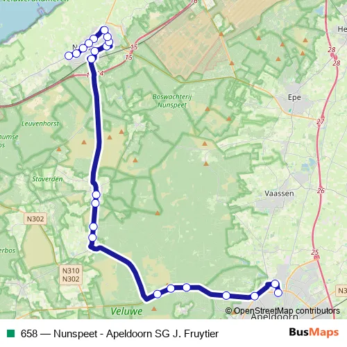 The first stop of the 658 bus route is Apeldoorn, Erasmusstraat and the last stop is Nunspeet, Vreeweg. 658 (Nunspeet - Apeldoorn SG J. Fruytier) is operational during on weekdays.