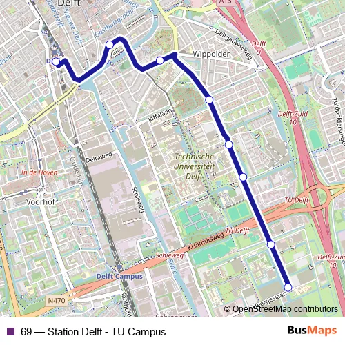 The first stop of the 69 bus route is Delft, Technopolis and the last stop is Delft, Station Delft. 69 (Station Delft - TU Campus) is operational during on weekdays.