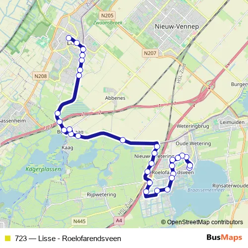 The first stop of the 723 bus route is Roelofarendsveen, Schoolbaan and the last stop is Lisse, Kanaalstraat. 723 (Lisse - Roelofarendsveen) is operational during everyday.