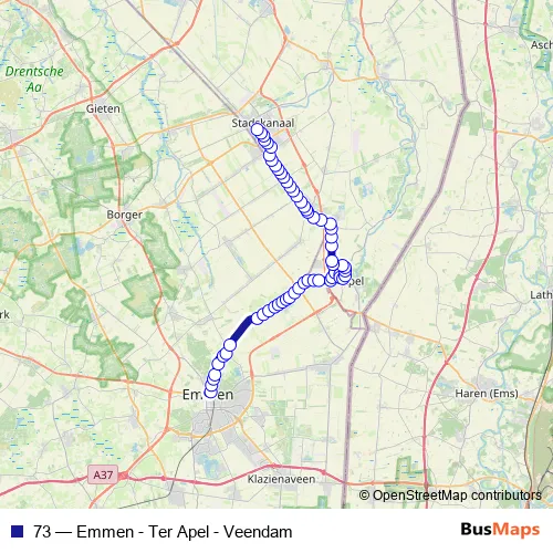 The first stop of the 73 bus route is Emmen, Station (Perron C) and the last stop is Stadskanaal, Busstation (Perron C). 73 (Emmen - Ter Apel - Veendam) is operational during everyday.