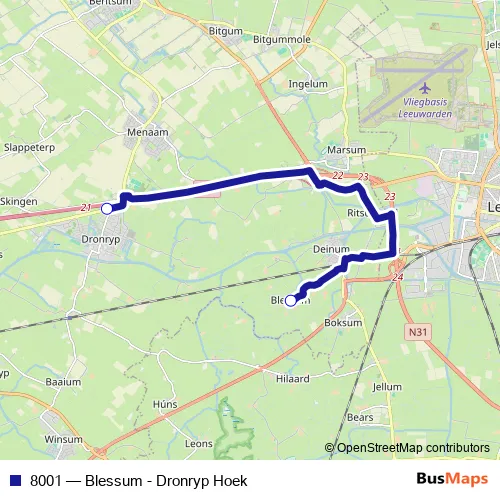 The first stop of the 8001 bus route is Blessum, Blessum and the last stop is Dronryp, Hoek Dronryp. 8001 (Blessum - Dronryp Hoek) is operational during everyday.