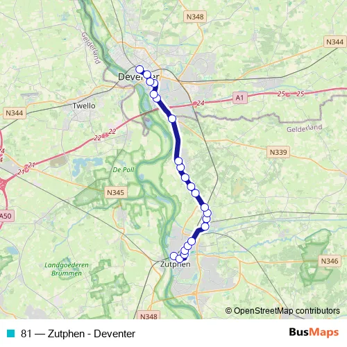 The first stop of the 81 bus route is Zutphen, Station and the last stop is Deventer, Station. 81 (Zutphen - Deventer) is operational during everyday.