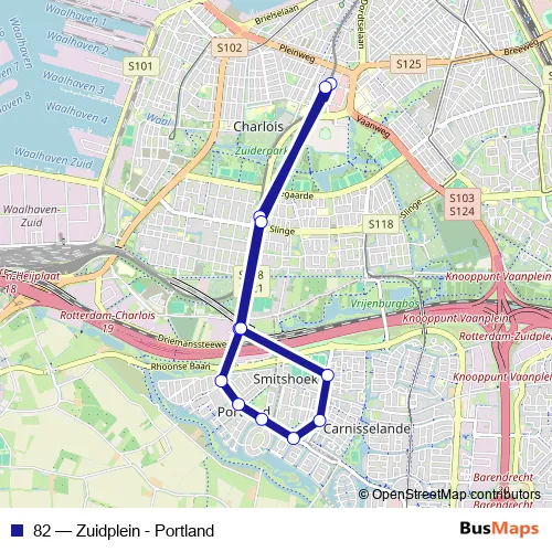 The first stop of the 82 bus route is Rotterdam, Zuidplein perron C and the last stop is Rotterdam, Zuidplein Hoog. 82 (Zuidplein - Portland) is operational during everyday.