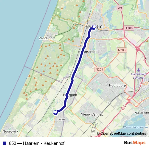 The first stop of the 850 bus route is Lisse, Keukenhof and the last stop is Haarlem, Station. 850 (Haarlem - Keukenhof) is operational during everyday.