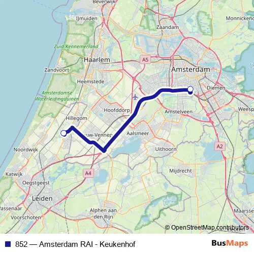 The first stop of the 852 bus route is Lisse, Keukenhof and the last stop is Amsterdam, Europaplein/Rai. 852 (Amsterdam RAI - Keukenhof) is operational during everyday.
