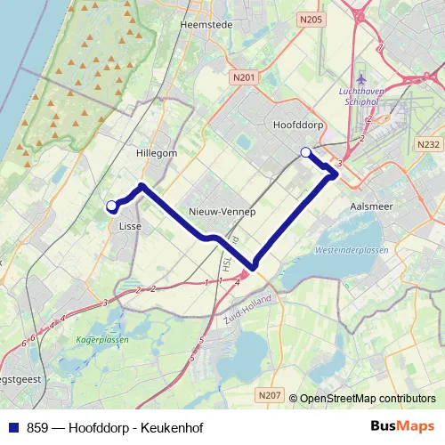 The first stop of the 859 bus route is Lisse, Keukenhof and the last stop is Hoofddorp, Station. 859 (Hoofddorp - Keukenhof) is operational during everyday.