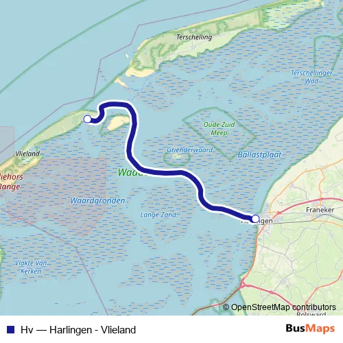 The first stop of the Hv ferry route is Harlingen and the last stop is Vlieland. Hv (Harlingen - Vlieland) is operational during everyday.