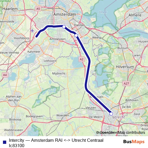Click here to view the nearest Intercity - Amsterdam RAI <-> Utrecht Centraal Ic83100 rail stop.