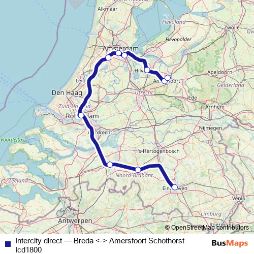 The first stop of the Intercity direct rail route is Breda and the last stop is Amersfoort Schothorst. Intercity direct (Breda <-> Amersfoort Schothorst Icd1800) is operational during everyday.