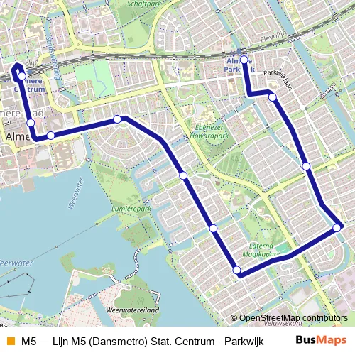 The first stop of the M5 bus route is Almere Stad, Station Parkwijk and the last stop is Almere Stad, Station Centrum. M5 (Lijn M5 (Dansmetro) Stat. Centrum - Parkwijk) is operational during everyday.