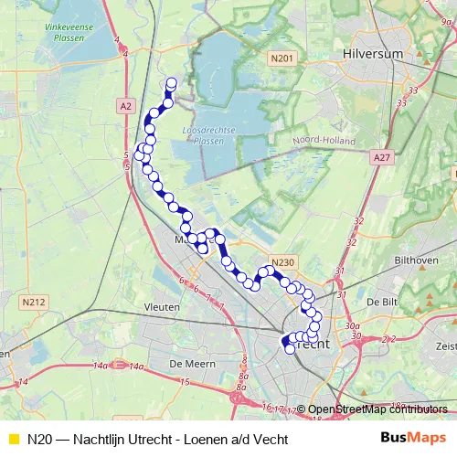 The first stop of the N20 bus route is Utrecht, CS Jaarbeurszijde and the last stop is Maarssen, Maarsseveensevaart. N20 (Nachtlijn Utrecht - Loenen a/d Vecht) is operational during on weekends.