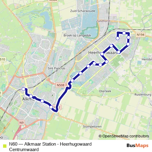 The first stop of the N60 bus route is Alkmaar, Station and the last stop is Heerhugowaard, Centrumwaard. N60 (Alkmaar Station - Heerhugowaard Centrumwaard) is operational during on weekends.