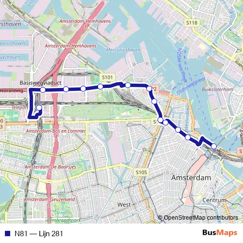 The first stop of the N81 bus route is Amsterdam, Centraal Station and the last stop is Amsterdam, Station Sloterdijk. N81 (Lijn 281) is operational during on weekends.