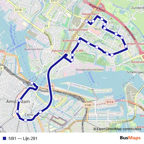 The first stop of the N91 bus route is Amsterdam, Centraal Station and the last stop is Amsterdam, Station Noord. N91 (Lijn 291) is operational during on weekends.