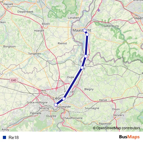The first stop of the Re18 metro route is Liège, Guillemins Bf and the last stop is Maastricht, Bf. Re18 is operational during everyday.