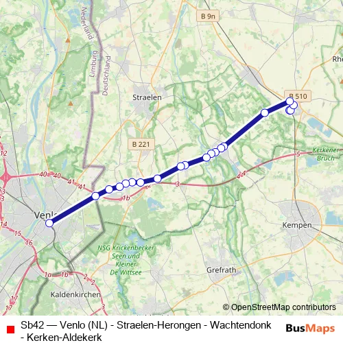 The first stop of the Sb42 bus route is Kerken Aldekerk Bf West Bstg 1 and the last stop is Venlo, Station (Bus). Sb42 (Venlo (NL) - Straelen-Herongen - Wachtendonk - Kerken-Aldekerk) is operational during everyday.