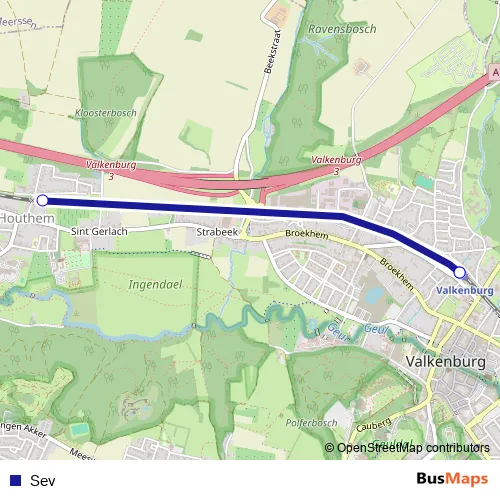 The first stop of the Sev bus route is Valkenburg, Bf and the last stop is Valkenburg, Bf. Sev is operational during everyday.