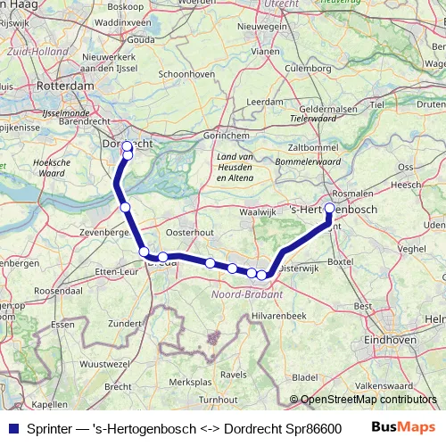 The first stop of the Sprinter rail route is 's-Hertogenbosch and the last stop is Dordrecht. Sprinter ('s-Hertogenbosch <-> Dordrecht Spr86600) is operational during everyday.
