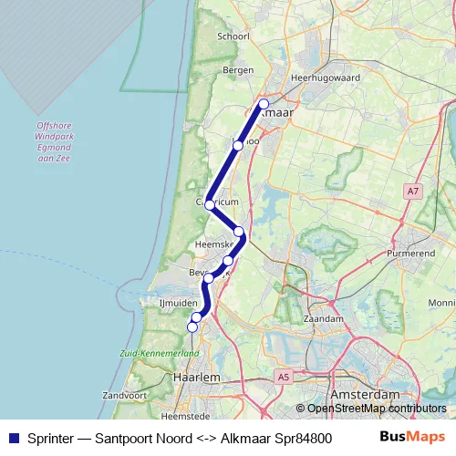 The first stop of the Sprinter rail route is Santpoort Noord and the last stop is Alkmaar. Sprinter (Santpoort Noord <-> Alkmaar Spr84800) is operational during everyday.