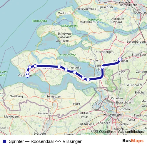 The first stop of the Sprinter rail route is Roosendaal and the last stop is