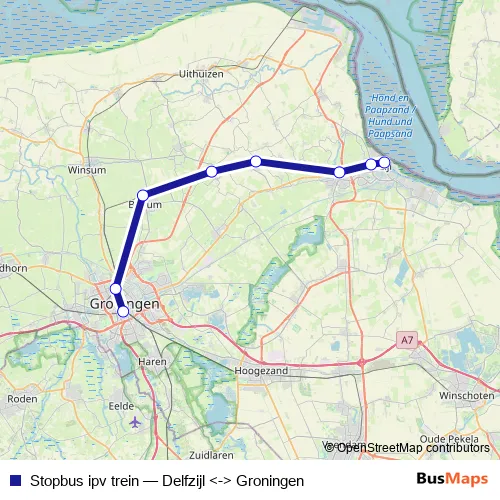 The first stop of the Stopbus ipv trein bus route is Groningen and the last stop is Delfzijl. Stopbus ipv trein (Delfzijl <-> Groningen) is operational during everyday.