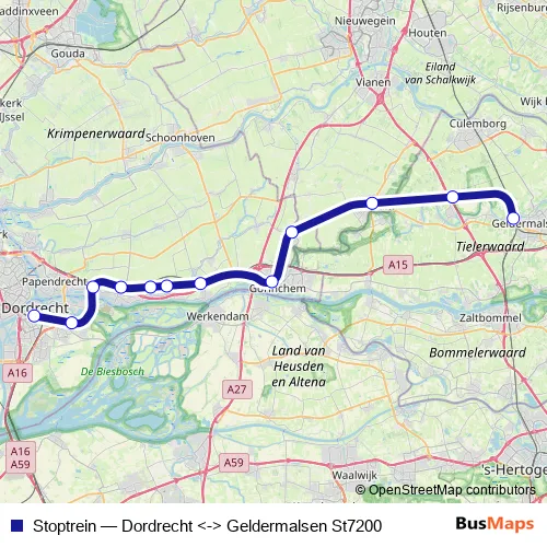 The first stop of the Stoptrein rail route is Dordrecht and the last stop is Geldermalsen. Stoptrein (Dordrecht <-> Geldermalsen St7200) is operational during everyday.