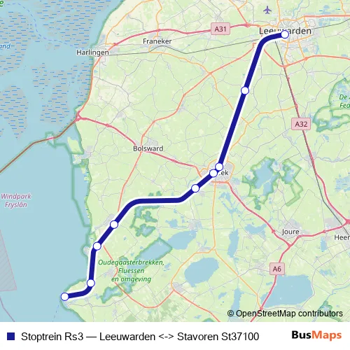 The first stop of the Stoptrein Rs3 rail route is Leeuwarden and the last stop is Stavoren. Stoptrein Rs3 (Leeuwarden <-> Stavoren St37100) is operational during everyday.