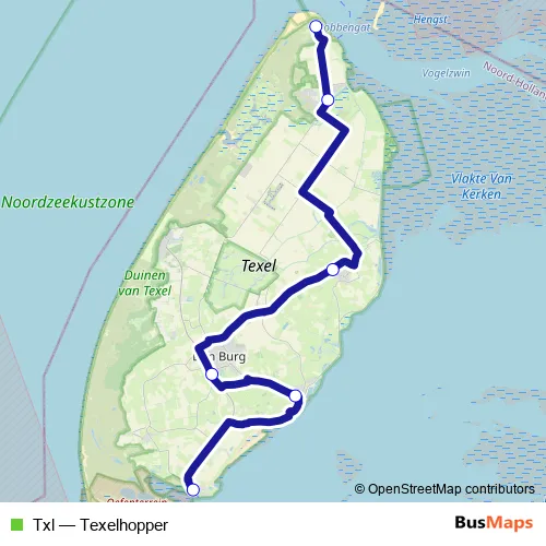 The first stop of the Txl bus route is Texel, www.texelhopper.nl and the last stop is De Cocksdorp, www.texelhopper.nl. Txl (Texelhopper) is operational during everyday.