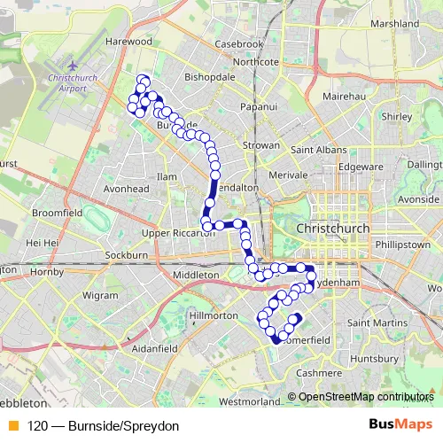See why over 2 million users trust and consider busmaps.com as the best public transport website. busmaps gives you Christchurch Buses suggested routes, real-time bus tracker, line route maps in Christchurch, and helps to find the closest 120 bus stops near you. No internet available? Download an offline PDF map and bus schedule for the 120 bus to take on your trip.
