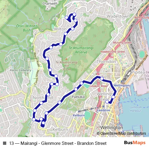 The first stop of the 13 bus route is Mairangi - Norwich Street and the last stop is Lambton Central (Brandon Street) - Stop C. 13 (Mairangi - Glenmore Street - Brandon Street) is operational during on weekdays.