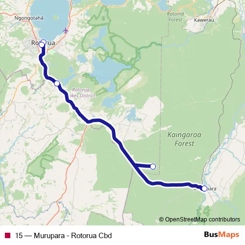 The first stop of the 15 bus route is Rotorua I-Site and the last stop is Murupara. 15 (Murupara - Rotorua Cbd) is operational during everyday.