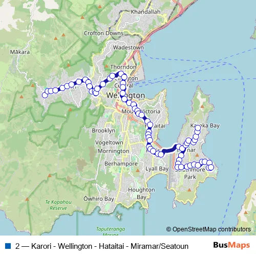 The first stop of the 2 bus route is Karori - Allington Road and the last stop is Seatoun - Hector Street. 2 (Karori - Wellington - Hataitai - Miramar/Seatoun) is operational during everyday.