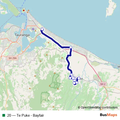 The first stop of the 20 bus route is Commerce Lane carpark and the last stop is Bayfair - Farm Street (Stand A2). 20 (Te Puke - Bayfair) is operational during everyday.
