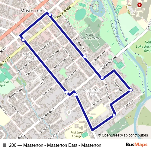 The first stop of the 206 bus route is Masterton - Church Street and the last stop is Masterton - Church Street. 206 (Masterton - Masterton East - Masterton) is operational during on weekdays.
