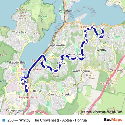 Click here to view the nearest 230 - Whitby (The Crowsnest) - Aotea - Porirua bus stop.